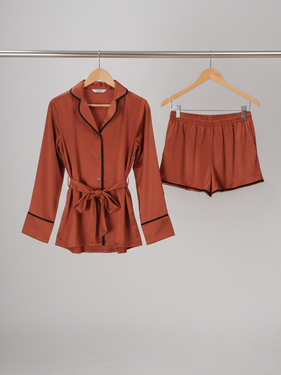 Unwind in golden-hour glow with our Amber Ease Co-ord Set. Made from silky rust-toned satin and accented with bold black piping, this set brings effortless elegance to your lounge moments.